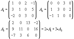 Von den folgenden 3 x 4 Matrizen ist A3 linear von A1 und A2 abhängig, A1 und A2 sind aber linear unabhängig.