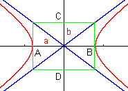 Wir können nun ein Rechteck zeichnen, das durch A und B geht und dessen Eckpunkte auf den Asymptoten liegen. Die Höhe dieses Asymptotenrechtecks gibt uns die Länge 2b der Nebenachse an, die Schnittpunkte mit der zweiten Symmetrieachse bezeichnet man als Nebenscheitel C und D. Das sind allerdings keine Hyperbelpunkte.
