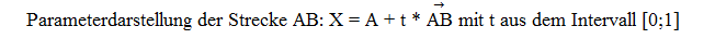Jedem Punkt X der Strecke ist genau ein Parameterwert t aus dem Intervall [0;1] zugeordnet. Durchläuft t alle Zahlen des Intervalls [0;1], so durchläuft X alle Punkte der Strecke AB. Mit anderen Worten: Die Parameterdarstellung stellt eine eindeutige Zuordnung zwischen den Zahlen des Intervalls [0;1] und den Punkten der Strecke AB her.