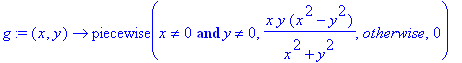 | > | g:=(x,y)->piecewise(x<>0 and y<>0,x*y*(x^2-y^2)/(x^2+y^2),otherwise,0); |