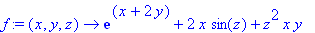 | > | f:=(x,y,z)->exp(x+2*y)+2*x*sin(z)+z^2*x*y; |