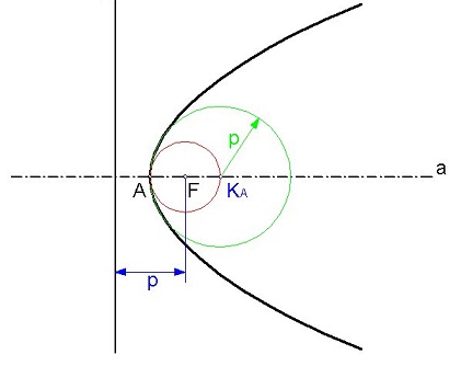 3. Der Schnittpunkt KA von der Normalen durch E und h ist der Mittelpunkt des Krümmungskreises kA im Scheitel A. Für den Krümmungskreisradius rA gilt: rA = b2 / a