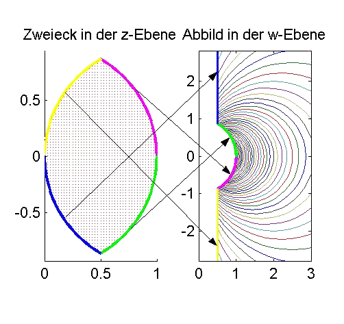 abgebildet, der andere Begrenzungsbogen des Zweiecks auf eine Gerade parallel zur imaginären Achse