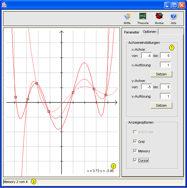 Ist die Checkbox Memory aktiviert so wird beim Löschen oder beim Einfügen eines neuen Stützpunktes, sowie beim Verschieben eines Punktes, zusätzlich zur neu entstehenden Kurve auch die vorige gezeichnet. Es können 5 Kurven pro Interpolationsverfahren gezeichnet werden. In (3) wird die Anzahl der gespeicherten Kurven angezeigt.