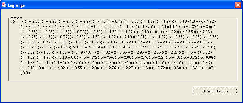 Beide Fenster beinhalten einen Button, der es ermöglicht zwischen den Ansatz von Newton bzw. Lagrange und den ausmultiplizierten Polynom umzuschalten. Der Button ändert dabei seine Beschriftung.