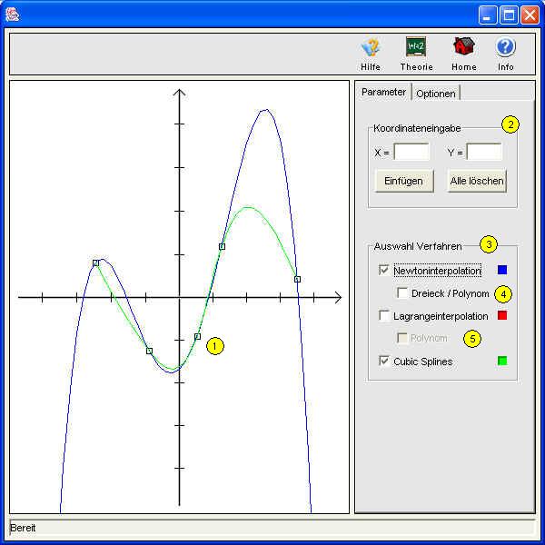In (3) kann das Interpolationsverfahren aufgewählt werden. Bei der Newtoninterpolation kann durch anklicken von (4) ein zusätzliches Fenster angezeigt werden.