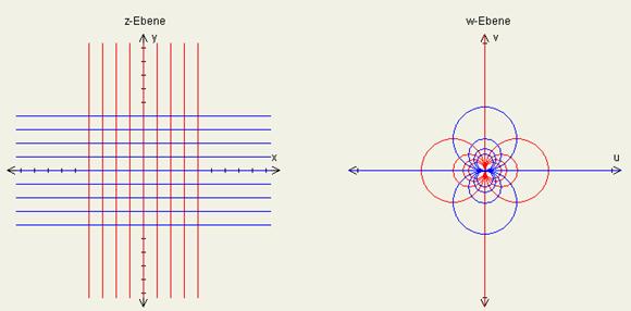 Die horizontalen Gitternetzlinien der oberen Halbebene, werden jedoch in Kreise der unteren Halbebene abgebildet und umgekehrt. Die Gitternetzlinie, die entlang der x-Achse verläuft wird wiederum in eine Gerade, die entlang der x-Achse verläuft, abgebildet.