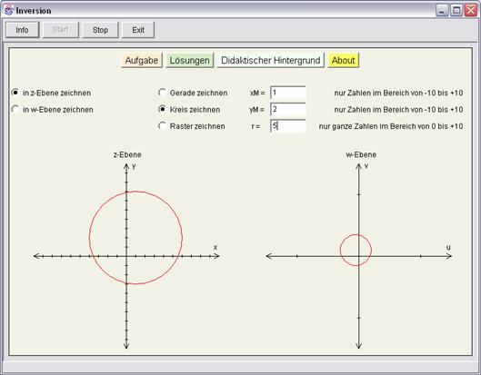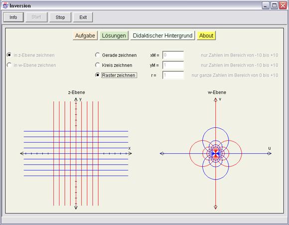 Es bleibt dabei Ihnen überlassen, ob Sie eine der oben erwähnten Ausgangsfunktionen, mit Ausnahme des Gitternetzes, entweder in der z-Ebene oder in der w-Ebene zeichnen lassen. Es wird in weiterer Folge automatisch die Abbildung der von Ihnen gewählten Funktion jeweils in der anderen Ebene erstellt.