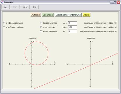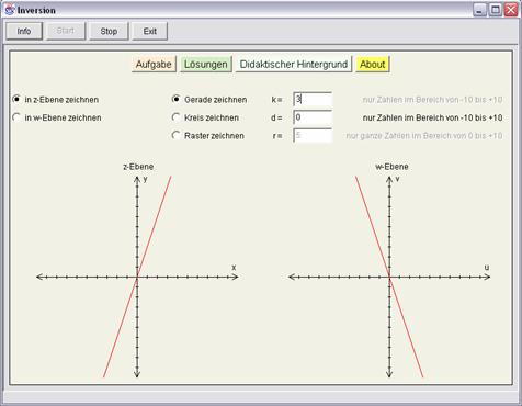 Über diese Radiobuttons können Sie auswählen, in welcher Ebene die Ausgangsfunktion gezeichnet werden soll. Diese Auswahl ist jedoch nur für die Zeichnung einer Geraden oder eines Kreises verfügbar und nicht für das Zeichnen des Koordinatengitternetzes. Das Koordinatengitternetz wird immer in der z-Ebene dargestellt, während dessen Inversion immer in der w-Ebene dargestellt wird.