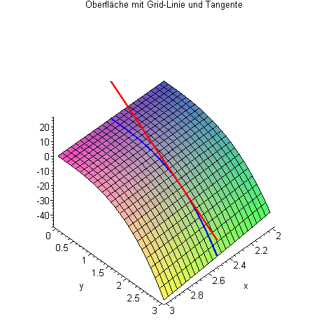 Man sieht hier die Oberfläche im Raum mit der blauen Grid-Linie und der Tangente an die Linie im Punkte (