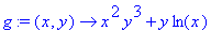 | > | g:=(x,y)->x^2*y^3+y*ln(x); |