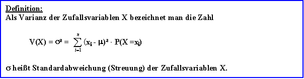 ist. Definition: Als Erwartungswert der Zufallsvariablen X bezeichnet man die Zahl E(X):
