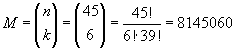 Stichprobe ohne Zurücklegen handelt.Nun wollen wir uns die möglichen Ausfälle überlegen: Es werden sechs Kugeln gezogen, d.h. k = 6; insgesamt gibt es 45 Kugeln, d.h. n = 45