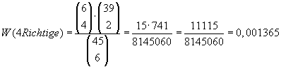 Wir haben ganz sicher einmal fünf Richtige. Das heißt wir überlegen uns nun zuerst die Wahrscheinlichkeit für einen Fünfer mit Hilfe der gerade hergeleiteten Formel:
