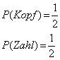 Zufallsexperiments.Zusätzlich muss man wissen mit welcher Wahrscheinlichkeit die einzelnen Versuchseergebnisse eintreten. Beim Werfen einer idealen Münze folgt aus Symmetriegründen, daß beide Seiten mit der gleichen Wahrscheinlichkeit auftreten. Da nur 2 Fälle möglich sind gilt:
