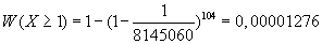 Die einzelnen Runden sind voneinander unabhängig, dass heißt die Wahrscheinlichkeiten bleiben immer gleich. Die Zufallsvariable X ist die Anzhal der Sechser in den 104 Spielrunden. Somit ist diese 104-p-binomialverteilt. Da wir mindestens einen Sechser innerhalb des Jahres wollen, suchen wir die