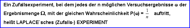 Im Gegensatz zu einem Laplace-Experiment, wo alle Ereignisse mit der selben Wahrscheinlichkeit eintreten, fordert ein Bernoulli Experiment zweierlei:
