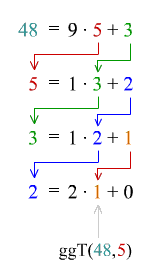 (Sie tritt auf, wenn in der Animation ![]() Der erweiterte euklidische Algorithmus besteht nun darin, ausgehend von der vorletzten Zeite, diese Rechenschritte "von unten nach oben" in der folgenden Weise aufzurollen, indem die einzelnen Zeilen nach den Resten aufgelöst und diese nacheinander eingesetzt werden: ![]() Beachte, dass dabei zwar alle aufretenden Klammern ausmultipliziert, nicht aber alle Produkte ausmultipliziert werden! Damit ist gezeigt, dass 2 · 48 - 19 · 5 = 1 gilt, woraus -19 · 5 mod 48 = 1 folgt. Nun haben wir die gesuchte Inverse schon fast gefunden. Da sie positiv und kleiner als 48 sein soll, addieren wir auf der linken Seite noch 48 · 5 (was auf der rechten Seite nichts ändert, da wir modulo 48 rechnen) und erhalten 29 · 5 mod 48 = 1. Unser Resultat lautet daher: |