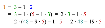 (Sie tritt auf, wenn in der Animation ![]() Der erweiterte euklidische Algorithmus besteht nun darin, ausgehend von der vorletzten Zeite, diese Rechenschritte "von unten nach oben" in der folgenden Weise aufzurollen, indem die einzelnen Zeilen nach den Resten aufgelöst und diese nacheinander eingesetzt werden: ![]() Beachte, dass dabei zwar alle aufretenden Klammern ausmultipliziert, nicht aber alle Produkte ausmultipliziert werden! Damit ist gezeigt, dass 2 · 48 - 19 · 5 = 1 gilt, woraus -19 · 5 mod 48 = 1 folgt. Nun haben wir die gesuchte Inverse schon fast gefunden. Da sie positiv und kleiner als 48 sein soll, addieren wir auf der linken Seite noch 48 · 5 (was auf der rechten Seite nichts ändert, da wir modulo 48 rechnen) und erhalten 29 · 5 mod 48 = 1. Unser Resultat lautet daher: |