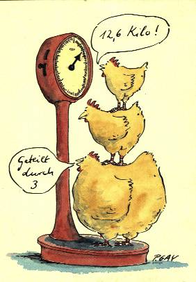 | Die Einheit für die Masse ist das Kilogramm (kg). Ursprünglich wurde 1kg als die Masse von einem Liter Wasser festgelegt. Genau ist 1kg definiert als die Masse des Urkilogrammstücks in Paris. | Der Vergleich von Massen wird mit Waagen durchgeführt. Waagen gibt es viele - Personenwaage, Briefwaage, Küchenwaage, ... Aber wer hat schon einmal eine Hühnerwaage gesehen (siehe Abbildung rechts)? | ![]() |