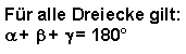 Allgemeines über Dreiecke: Geschlossene Streckenzüge aus drei Strecken werden Dreiecke genannt. Die Summe der Innenwinkel eines Dreiecks beträgt 180°. Jeder Innenwinkel hat zwei gleich große Außenwinkel. Jeder Innenwinkel und ein zugehöriger Außenwinkel ergeben zusammen 180°. |