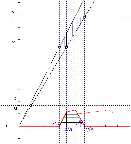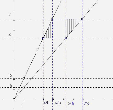 Die 4 Ecken des schraffierten Vierecks haben die Koordinaten (x/b,x), (y/b,y), (x/a,x) und (y/a,y).