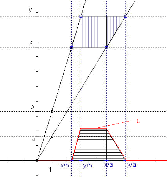 In Abbildung 1 sind die Intervalle [ a, b ] und [ x, y ] eingezeichnet. Die Multiplikation des Intervalls [ a, b ] mit beliebigen keN ergibt anschaulich eine sich öffnende Schere aus den Geraden ak und bk. Der blau schraffierte Bereich zeigt die Schnittmenge zwischen [ka,kb] und [x,y]. Die Länge des Schnittbereichs entspricht dem vertikalen Abstand zwischen der x-Geraden und der y-Geraden innerhalb des schraffierten Bereichs.