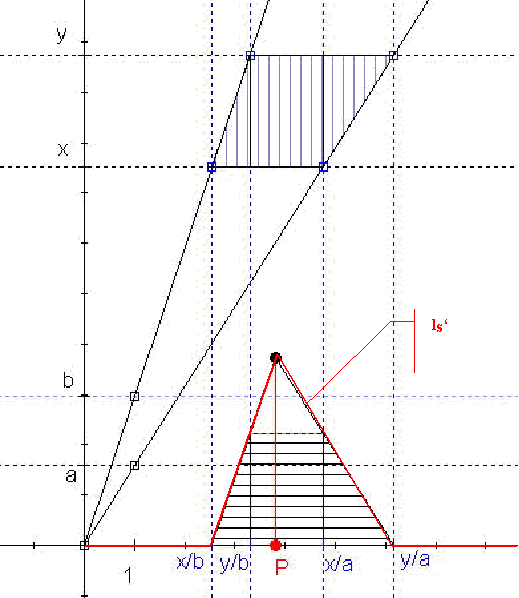 In Abbildung 1 verlängere ich die steilen Geraden nach oben und erhalte einen Schnittpunkt, der zwischen y/b und x/a liegt. Den Lotpunkt von diesem Schnittpunkt auf die Ordinate nenne ich P.