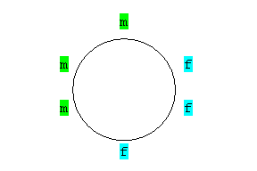 Es muß gelten: Länge * Periode = m + f = n. Die interne Drehsymmetrie einer Anordnung erfordert aber auch, daß die Summe der Anzahlen von Männern und Frauen in dem Muster mit Periode d jeweils genau m/d bzw. f/d ist. Für m = f = 3 muß die Anzahl der m’s und f’s in einem Muster mit Periode 2 gleich m/2 = 3/2 bzw. f/2 = 3/2 sein. Das ist nicht möglich. Daran sieht man, daß es kein Muster der Länge 3 gibt. Es gibt Muster der Länge 2. Deren Periode ist 3 und m/3 = 1 bzw. f/3 = 1.