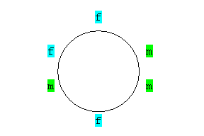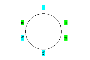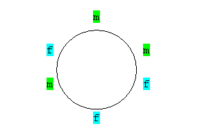 Kurz gefaßt lauten diese Regeln: Das ist ein sehr allgemeiner Weg. Aber wie es so ist, ist der Weg das Ziel. Also dann ... Für 3 Männer und 3 Frauen probiere ich einige mögliche Sitzordnungen und stelle schnell fest, daß ich leicht die eine oder andere Drehungsmöglichkeit übersehen kann, wenn ich nicht ein sicheres Unterscheidungsmerkmal für die Anordnungen finde.