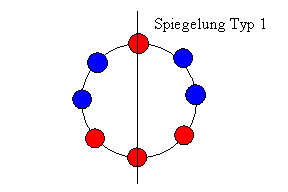 Für eine Spiegelung vom Typ 1 gibt es 24 Anordnungen, die auf sich selbst abgebildet werden. Die beiden Perlen auf der Spiegelachse müssen von der gleichen Farbe sein (2 Möglichkeiten). Von den drei Plätzen auf einer Seite der Spiegelachse wird einer ausgewählt, der die gleiche Farbe erhält, wie die Perlen auf der Spiegelachse (3 Mögl.).
