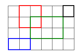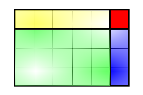 Abbildung 2: Das Quadrat links oben färbe rot. Das rote Quadrat ist in Spalte v=6 und Zeile w=4. Die Anzahl der möglichen Rechtecke in diesem Gitter mit v Spalten und w Zeilen kann man nun disjunkt aufteilen in: |