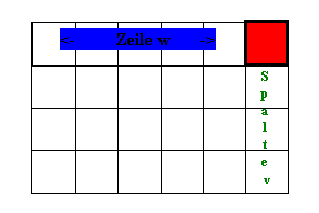 Wir stellen uns dieses Gitter aufgezeichnet vor und markieren das rechte obere Quadrat (machen es "rot"). Die Spalten und Zeilen numerieren wir von 1 bis v bzw. von 1 bis w, so daß das rote Quadrat in der Spalte v und in der Zeile w liegt. |