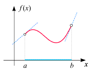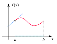 Diese Funktion sei im abgeschlossenen Intervall [a, b] definiert. Sie besitzt (neben zwei Extrema im Inneren, die nicht eigens hervorgehoben sind) ein lokales Minimum an der linken Randstelle a und ein globales Maximum an der rechten Randstelle b. Beachten Sie, dass an diesen beiden Stellen die Ableitung nicht 0 ist. Diese Funktion sei im halb-offenen Intervall [a, b), d.h. für a £ x < b definiert. Sie besitzt (neben zwei Extrema im Inneren, die nicht eigens hervorgehoben sind) ein lokales Minimum an der linken Randstelle a. Da sie an der Stelle b nicht definiert ist, ist diese keine lokale Maximumstelle.