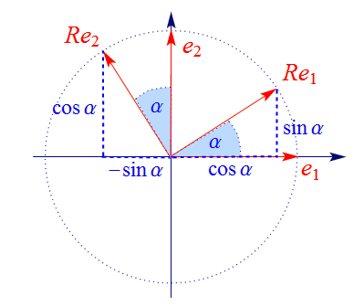 dass $Re_1$ bzw. $Re_2$ aus $e_1$ bzw. $e_2$ durch eine Drehung im Gegenuhrzeigersinn um den Winkel $\alpha$
