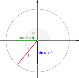 Ist a zwischen 180° und 270° (der Zeiger liegt im dritten Quadranten), so sind sin a und cos a beide negativ. |