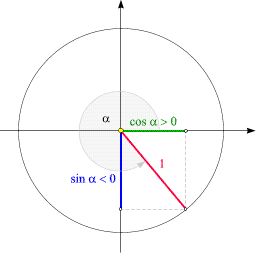 Ist a zwischen 270° und 360° (der Zeiger liegt im vierten Quadranten), so ist sin a negativ und cos a positiv. |