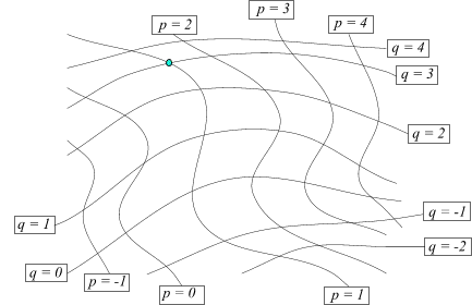 Die Koordinaten heißen p und q. Zu jeder eingezeichneten Koordinatenlinie ist angegeben, welche Koordinate sich entlang ihr nicht ändert und welchen Wert sie hat.